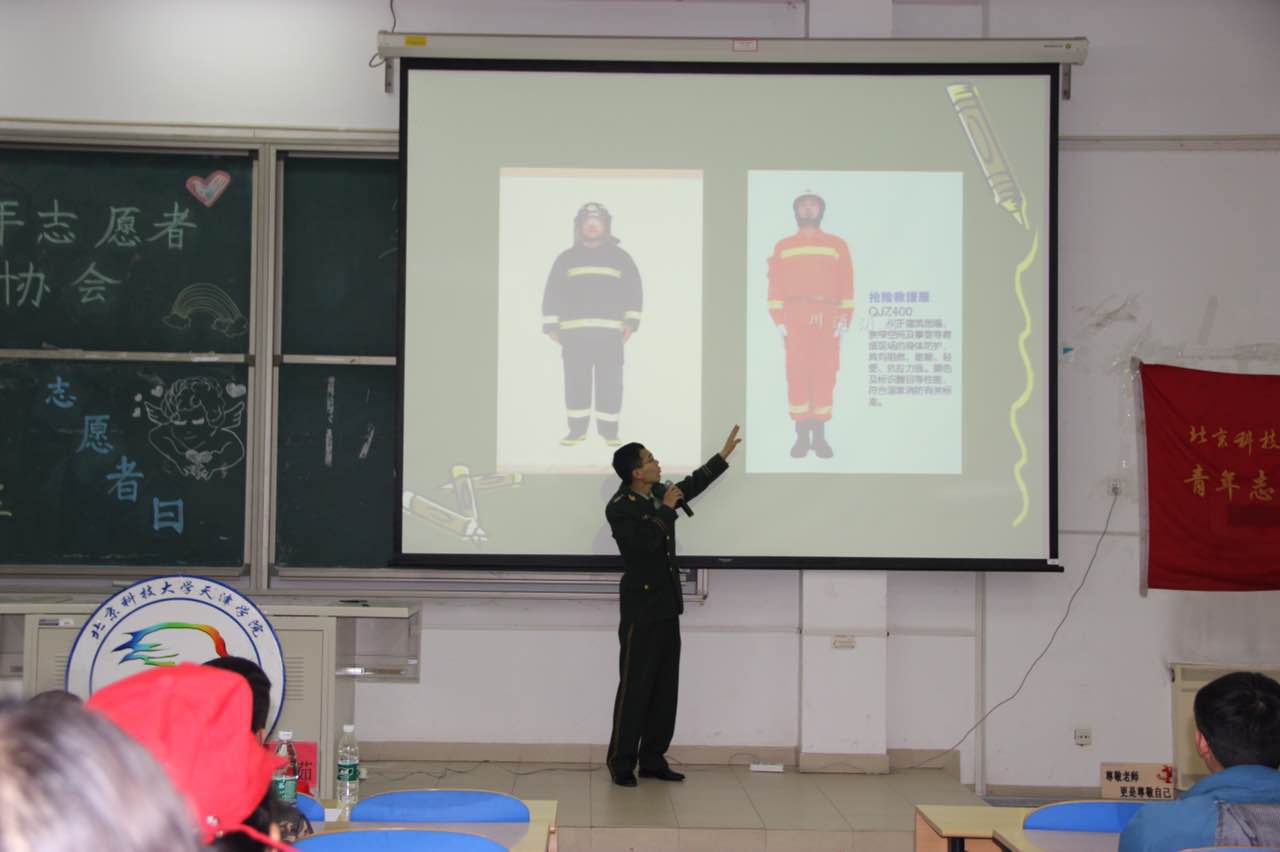 晚上六点半,9教108教室,消防安全知识讲座在大家热烈的掌声中正式开始。在播放开场视频之后,顾队长开始了正式的演讲。顾队长的讲解深入浅出,内容涉及火灾发生的原因、怎样预防火灾、火场逃生基本知识、灭火器的正确使用以及如何正确报警等方面进行了生动讲解。顾队长不仅从理论上向大家传授关于消防的各种安全防范知识,而且列举了大量实际生活中的真实案例,教训深刻,发人深省。战斗班班长肖佳现场演示并教授学生消防服及配件的穿戴方法,并邀请了几名同学亲身试穿了消防官兵的战斗服。穿着厚重的战斗服,同学们体会到了消防官兵的不易,并且向消防官兵表达了敬意。最后以一段京津新城消防官兵冰上救人的英勇视频结束了此次消防知识讲座。