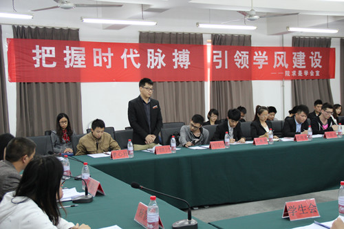 研讨会开始后,求是学会代表做引入性发言,倡导青年学生应该牢记时代重托,从根本着手,建设优良学风。土木系代表闫希晔以当前的考风考纪和学风问题为切入点,引出终身学习才是学习的根本,告诫当代大学生要以学习充实青春,用知识浇灌岁月;材料系代表何欢欢则以“发挥干部先进性,争当学习排头兵”为主题,从“小处着手、以点带面”,“宣传教育、从我做起”多方面为要旨进行探讨;而机械系代表杨明辉则以“牢牢坚持学习之本,紧紧把握学风之根”为主题,从机械专业的角度出发,提出要先做人后做学问的观点;信息系代表雷垒论述则更为实际,他根据“以学为基、以学立行”这一主题,讲到首先应该从班级做起,做到充分调动广大同学的主观能动性,最后达到养成良好的职业道德的目标;之后,经济系代表吴鹏宇和艺术系代表冯倩蔚则分别以“准确订立学习目标、圆满实现人生规划”和“勤学苦读求真知、深思明辨建学功”为主题进行了发言。自由讨论环节,与会代表积极发言,阐述自身观点,提出问题,分析问题,现场气氛热烈而有序,团委副书记潘柏夷对主题发言进行点评,同时强调学生干部应积极响应和带头引领学风建设。大会最后,团委书记罗富臣对本次研讨会进行总结,罗老师分别从为什么要让学生干部谈学风、为什么要把学风建设和把握时代脉搏相结合、学生干部应该如何引领学风建设三个方面进行总结,并指出当前要紧紧以实现中华民族伟大复兴的中国梦这一长远目标为引导,立足实际,充分发挥学生干部的带头作用,从我做起、做好表率,做到成绩达标、带队有为,同时能剖析不足、寻找对策,为自身发展和学院建设不断努力。伴随着全场热烈的掌声,本次研讨会圆满结束!