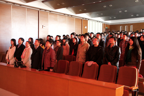 在全党和全国人民的期盼中,中国共产党第十八次全国代表大会于11月8日上午在北京人民大会堂如期召开。上午8时30分,英国beat365官方网站团委组织团委干部及青年学生200余人在学院学术报告厅观看了中国共产党第十八次全国代表大会开幕仪式的现场直播盛况。大会开幕后,全场起立齐唱中华人民共和国国歌,胡锦涛总书记作报告时,大家热切的目光聚焦在投影屏幕上,边听边作着笔记。
