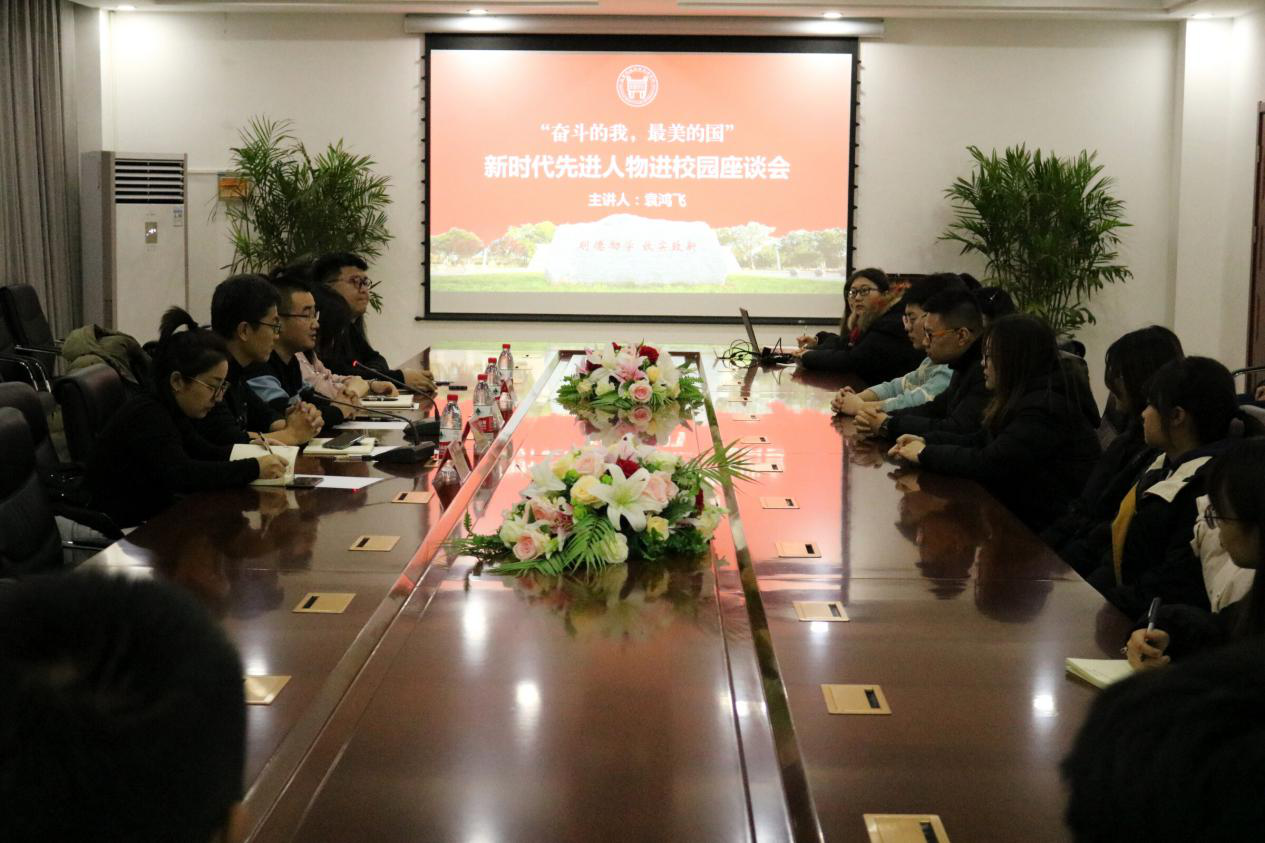 为深入学习贯彻习近平新时代中国特色社会主义思想和党的十九大精神,发挥新时代先进人物的榜样示范作用,2019年12月24日下午,beat365在12教300会议室开展了“新时代先进人物进校园”座谈会,特邀共青团宝坻区委员会副书记、宝坻区新闻中心记者、宝坻区一家亲青年志愿服务社理事长袁鸿飞参加,同时学院学生处常务副处长田勇、团委副书记李洋、何欢欢出席本次座谈,学生代表共40余人参加本次座谈会。