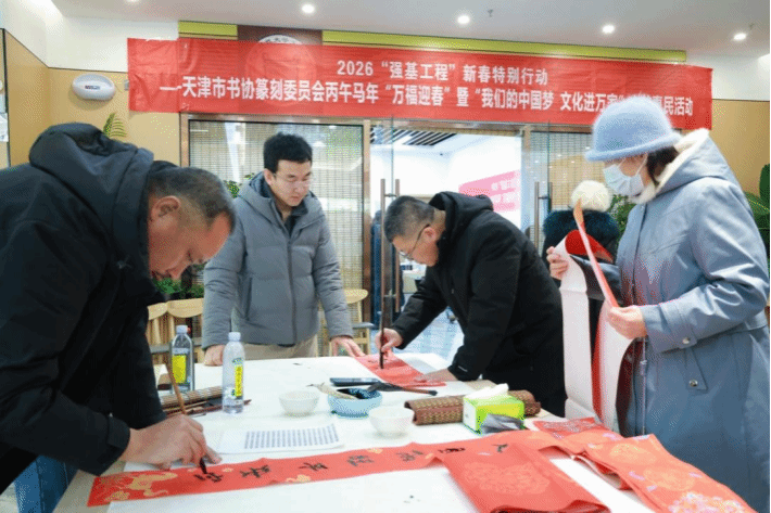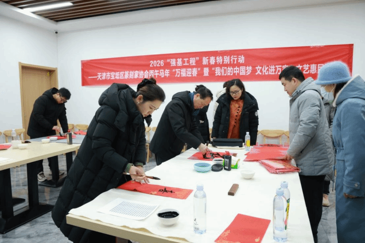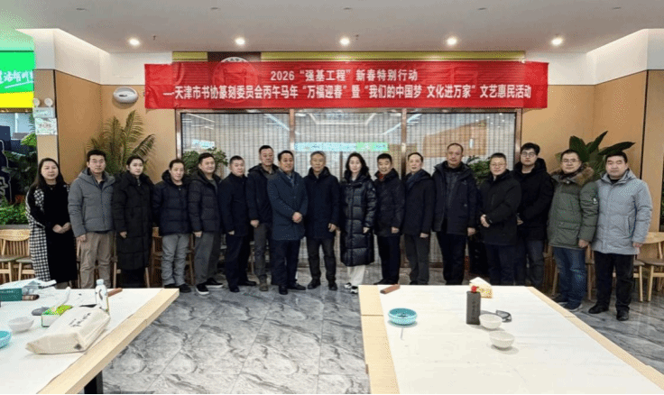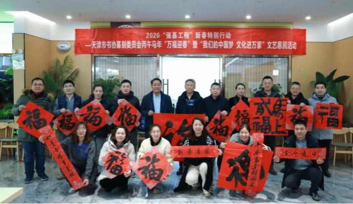 为深入贯彻落实“强基工程”与“我们的中国梦·文化进万家”号召,推动中华优秀传统文化扎根基层、滋养校园,2026年1月19日上午9:30,由天津市书法家协会篆刻委员会主办的新春特别行动“万福迎春”文艺惠民活动在英国beat365官方网站隆重举行。天津市书法家协会副主席、篆刻委员会主任李绍晨带领来自天津市书协篆刻委员会、宝坻区书协及篆刻家协会的12位知名书法家走进校园,以笔墨传递祝福,以艺术温暖人心。学院副院长张永锋、副院长兼财务总监王俊敏、党委副书记郭雅娟以及天津学院师生等参加活动。