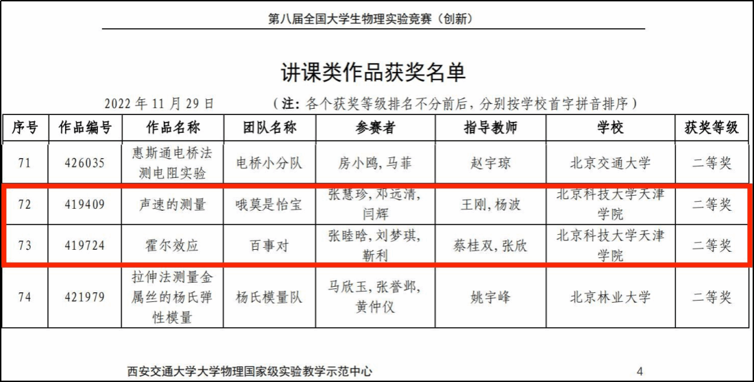 2022年11月29日,由国家级实验教学示范中心联席会物理学科组、全国高等学校实验物理教学研究会、教育部大学物理课程教学指导委员会大学物理实验专项委员会和中国物理学会物理教学委员会联合举办,西安交通大学物理学院承办的2022年第八届全国大学生物理实验竞赛成功举行,beat365两支代表队在比赛讲课类赛道中荣获佳绩,两支队伍均获得二等奖的好成绩。