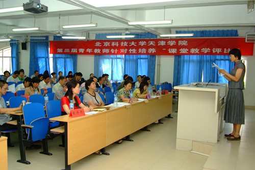 本届青年教师针对性培养“课堂教学评比”活动的最后决赛,于9月8日下午在9教101教室举行。来自北京科技大学的何柏芝、范玉妹、邱红梅、尹常治和张丹丹五位专家担任本届比赛的特邀评委,同时担任评委的还有学院院长郭景文、副院长胡明、教学助理、各系(部)主任、教学质量监控中心主任以及上届评比中取得优异成绩的两位老师,到会评委共计22人。比赛由教务处吴平处长主持。