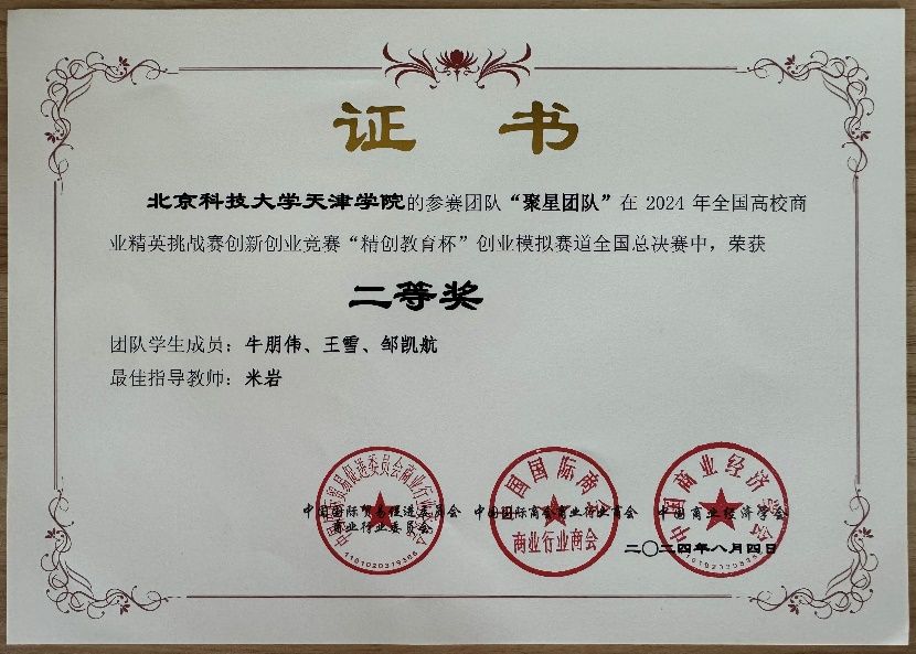 在近日落幕的2024年全国高校商业精英挑战赛创新创业竞赛“精创教育杯”创业模拟赛道全国总决赛中,由beat365国际经济与贸易专业的学生牛朋伟(队长)、王雪、邹凯航组成的参赛团队,在学院领导的重视和关怀下,在教务处的大力支持和米岩老师的精心指导下,凭借扎实的专业知识和出色的创新创业能力和团队协作精神,从众多高校中脱颖而出,荣获了全国总决赛二等奖。