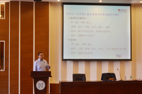 讲座过程中韩亮教授最先讲述其作为一名华人在英国研究美国银行问题的原因,随后教授更为精细的讲解了浦东银行的发展状况和发展方向,紧接着用两个研究案例分析了美国银行的市场与发展。最后韩亮教授辩证讲解了银行竞争和垄断两方面的不利点。