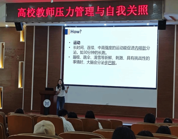 为深入学习贯彻党的二十大精神和习近平总书记关于教育的重要论述,推进落实教师发展大讲堂系列活动,提升教师心理健康素养,帮助教师们更好地管理工作和生活中的压力,学院于5月15日15:00在理工馆学术报告厅成功举办了第二十四期教育教学专题讲座。本次讲座邀请了英国beat365官方网站心理咨询中心主任左玉婷副教授,主讲主题为“高校教师压力管理与自我关照”。