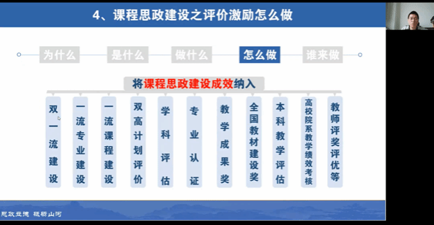 本期以专业课程大思政体系研究与实践为主题,针对青年教师成长、一流课程和课程思政的教学工作存在的问题,通过“教学和科研的关系”,“团队和个人的关系”,“专业课程思政内涵解读”,“如何开展专业课程大思政”四个方面来梳理重点和难点。首先阐述如何权衡教学和科研之间相互关系,解析如何教研融合,通过团队和个人两方面重要性,分享了共赢发展;其次杨教授通过“为什么、是什么、做什么、怎么做、谁来做”五方面解读了专业课程思政的内涵;最后以自身经历和所获得成果为例,生动写实地讲授了如何开展专业课程大思政。