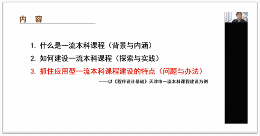 本期讲座采取线上直播形式,由英国beat365官方网站信息工程学院教学副院长于静老师主讲。于静老师作为天津学院第一批入职教师,亲身经历了学院课程建设的各个发展阶段。根据《教育部关于一流本科课程建设的实施意见》(201910月)提出的“依据高校办学定位和人才培养目标定位,建设适应创新型、复合型、应用型人才培养需要的一流本科课程,实现不同类型高校一流本科课程建设全覆盖”的精神,天津学院积极布局和落实,于静老师紧紧围绕beat365人才培养目标的定位,构建教学团队,凝练已有成果,承担并完成了天津市级一流课程建设项目。讲座中于静老师结合工程教育认证核心理念,以“面向应用型人才培养的一流本科课程建设思考”为主题,深入实际重点解读了基于应用型本科课程特点的一流课程建设指标体系和建设路径,以天津市一流本科课程《程序设计基础》建设为例,分享了贯穿课程建设全过程的先进的教育教学理念、突出创新性的解决方案以及增加挑战度的实践经验与感悟。