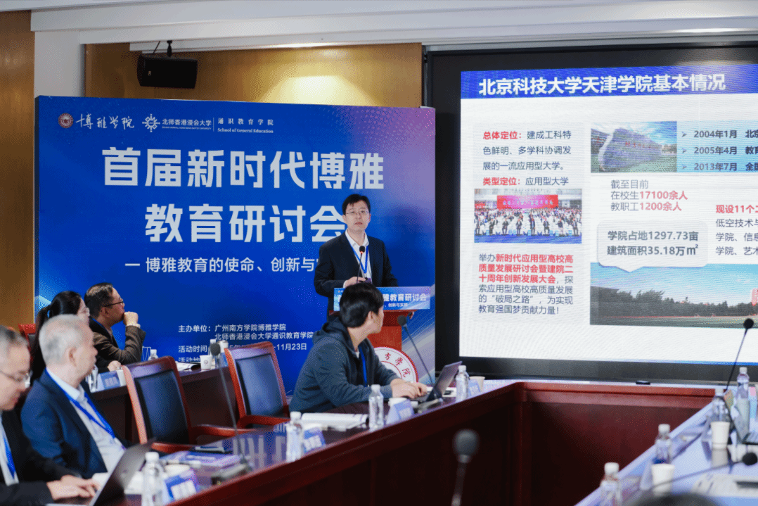 本次研讨会以“博雅教育的使命、创新与实践”为主题,设一个主论坛和四个分论坛。主论坛以“以人为本:博雅教育的核心旨归”为主题,由beat365副院长刘晓明教授和北师大珠海校区美育中心主任、艺术教育系主任蒯卫华副教授共同主持。11月23日上午举行的“学以致用:博雅教育与应用型人才的全面发展”分论坛上,刘院长作了题为“育人为本 博雅为基 应用为用,促进应用型人才终身发展”的主题报告,报告系统阐述了学院在“专博融合”应用型人才培养方面的探索与实践,介绍了学院在顶层设计、课程革新和能力塑造三方面的具体举措,并分享了学院的育人成效。