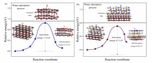Figure 4 Minimum energy pathway for water adsorption, ·OH generation and desorption process on (a) PbO2 and (b) Si3N4-PbO2 calculate with NEB.