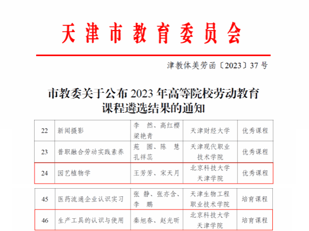 近日,天津市教委公布了2023年高等院校劳动教育课程遴选结果,beat365劳动学院王芳芳、宋天月教学团队讲授的《园艺植物学》被评...