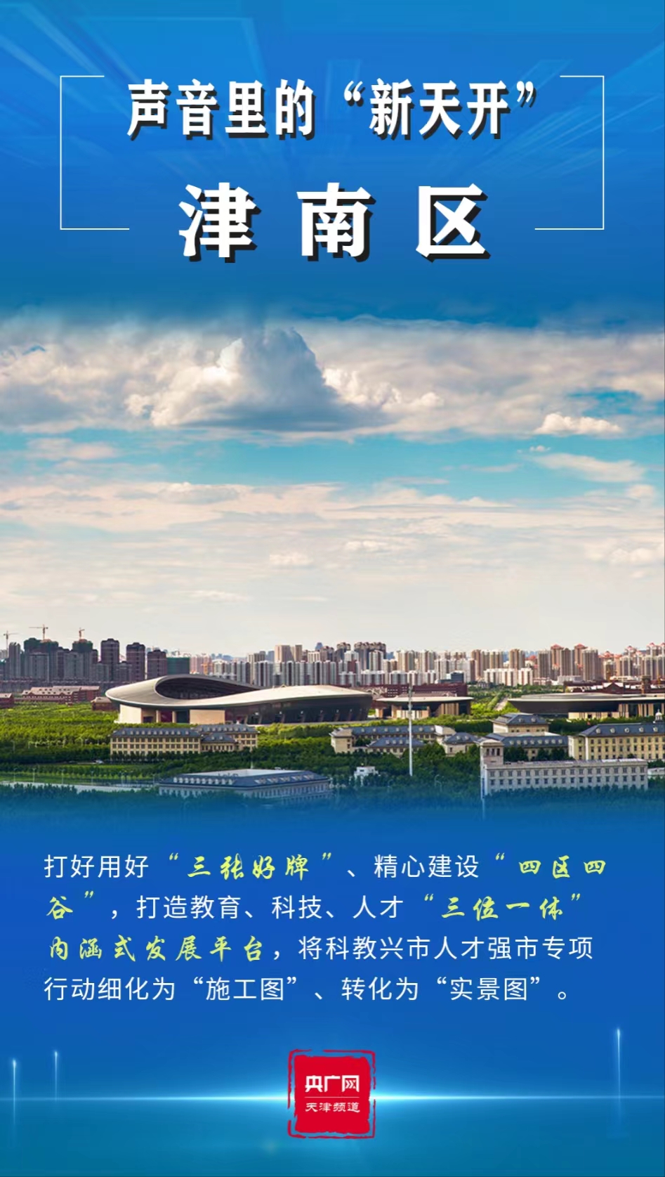 央广网天津5月12日消息 2023年是全面贯彻党的二十大精神的开局之年。寅末卯初,天津市委经济工作会议召开,高站位、高标准谋划“十项行动”,逐步将党的二十大擘画的宏伟蓝图推向实景。其中,一个响亮的名字——“天开高教科创园”(以下简称“天开园”)引发广泛关注。“天开”,既融合了南开大学、天津大学两所百年名校,亦有得天独厚、开拓进取等寓意,为人们带来无限想象空间,可谓石破“天开”。
