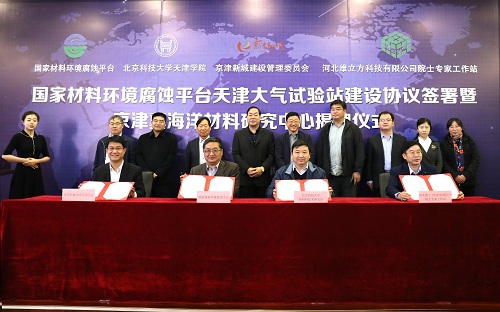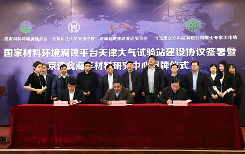 仪式上,国家材料环境腐蚀平台主任李晓刚教授,京津新城管委会周振亮书记,英国beat365官方网站党委书记、院长王斌共同签署了国家材料环境腐蚀平台天津大气试验站建设协议。