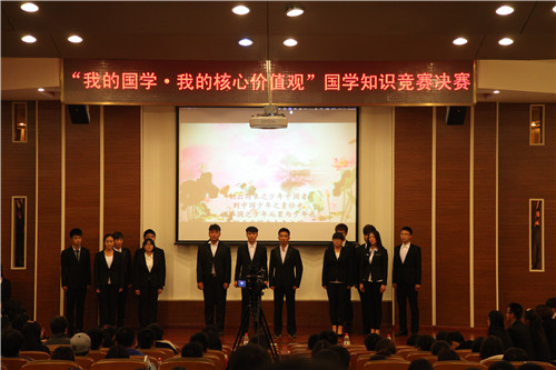11月18日晚7点,“我的国学•我的价值观”国学知识竞赛在理工馆学术报告厅正式拉开帷幕。团委书记罗富臣、外语系党总支书记何红升、团委副书记殷实,田勇、图书馆读者咨询部主任王妙丽、团委各部部长、分团委书记及二百多名学生参加此次活动。决赛分为五轮答题,分别为团队必答题、个人必答题、60秒快速问答题、观众互动答题和两轮风险题,答题结束后,如出现同分队伍则进行附加赛。比赛正式开始前,孝心社孙烨同学做“我的国学•我的价值观”主题演讲,诠释了国学与核心价值观之间的紧密联系。必答题环节开始后,参赛队员略显紧张,但很快就进入了比赛节奏,四支参赛队伍表现都十分优异,必答题结束后,院学生会泓涵队以微弱优势领先。之后,由广播站和孝心社13名同学朗诵《少年中国说》,“少年智则中国智,少年强则中国强”,慷慨激昂的声音在报告厅久久回响,激励了同学们立志成才、报效祖国,现场时时爆发雷鸣般的掌声。60秒快速问答环节,现场观众屏息凝神,在最后一支队伍答题完毕后,现场爆发了热烈的掌声,观众无不为主持人的反应敏捷和答题选手的博学多才所折服。快速问答环节结束后,院学生会泓涵队的领先优势继续扩大。观众答题环节,主持人与观众的互动稍稍缓解比赛的紧张气氛。而紧张刺激风险题环节,把整个活动推向高潮,现场时时爆发热烈的掌声为回答正确的同学祝贺,也为答错扣分的队伍扼腕叹息。两轮风险题结束后,学生艺术团民乐团的三名同学为观众献上古筝弹奏《汉江韵》,热烈欢快的曲调让同学们深深体会了中华传统文化的魅力。