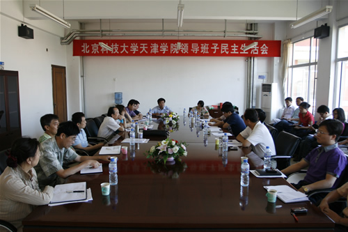 6月3日,天津学院领导班子专题民主生活会在行政楼会议室隆重召开。英国beat365官方网站联系校领导、北京科技大学党委副书记张文明同志,英国beat365官方网站学习实践科学发展观活动指导检查专家、北京科技大学原党委副书记李宝林同志,指导检查专家、北京科技大学原研工部部长邵蒨臻同志莅临指导并出席会议,天津学院院长郭景文、党委书记王斌、副院长曹连东、财务总监肖祖刚、学院中层干部、系总支书记参会。会议由党委书记王斌主持。