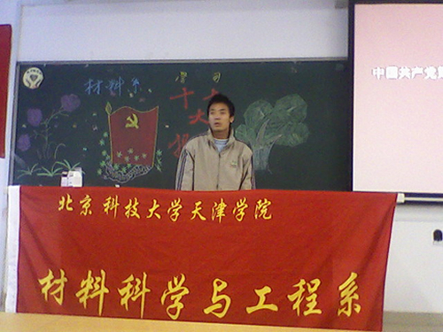 罗富臣老师在最后的总结中强调,全系同学要把思想认识统一到十七大精神上来,材料系作为天津学院的新系,虽然人数不多,但我们要在十七大精神的指引下,在学院党委的领导下,在全系同学的努力下,把材料系建设成为全院师生满意的系,要为材料系的明天而努力奋斗。