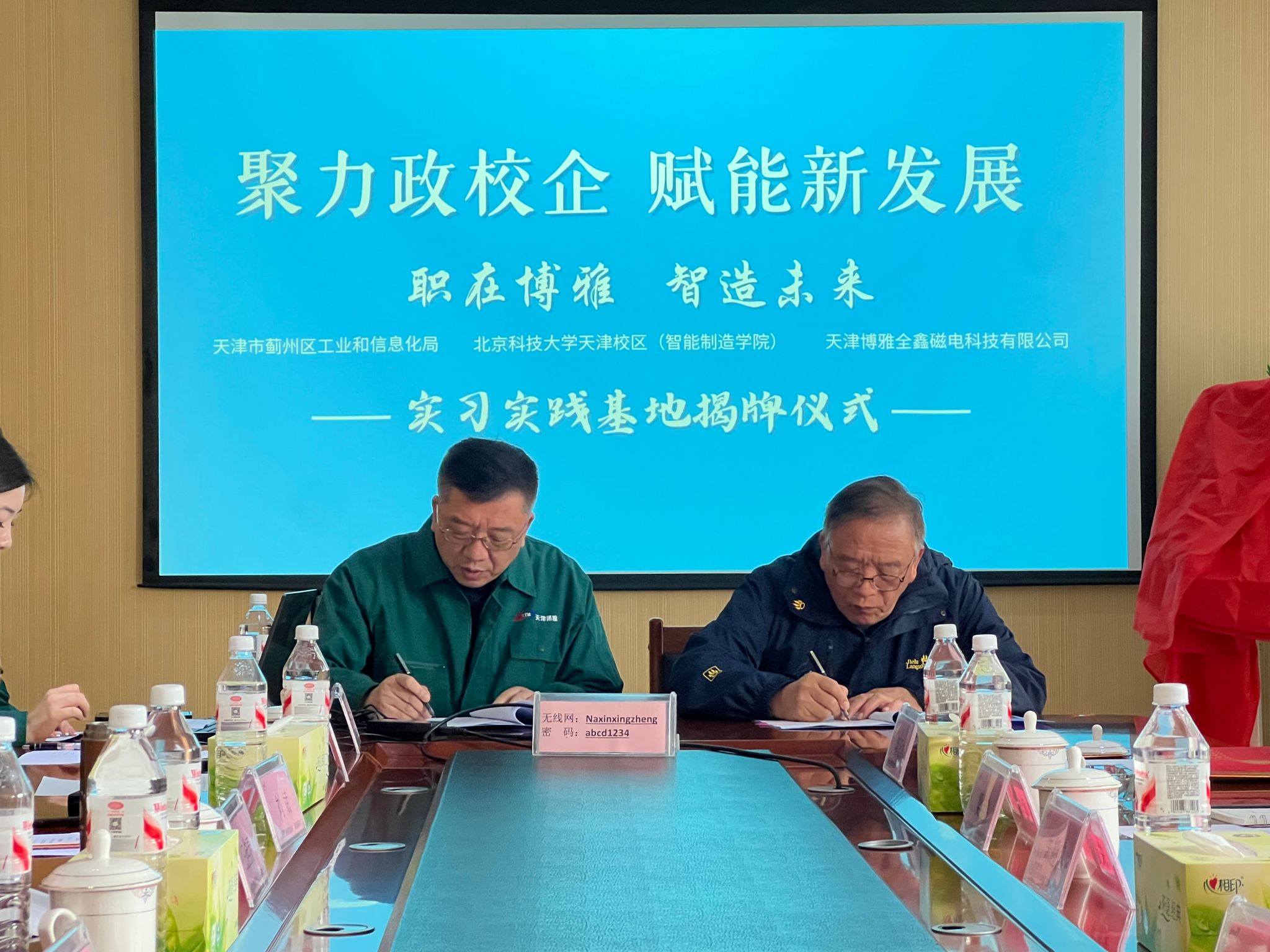 为深化产教融合,协同推进应用型人才培养,打造高水平实践育人新平台,2025年11月7日上午,智能制造学院与天津博雅全鑫磁电科技有限公司(以下简称“博雅磁电”)实习实践基地签约揭牌仪式在博雅磁电总部办公楼会议室隆重举行。蓟州区工信局副局长王桂春、四级调研员刘斌,博雅磁电总经理游峰、管理部部长王菲,蓟州区中小企业协会秘书长付旭升,智能制造学院院长朱超甫、外国语学院院长滕建辉、天津学院教师发展中心主任隋延力、天津学院创业指导中心副主任张素杰、材料与环境学院环境工程系副主任梁宝瑞等共同出席了此次活动。