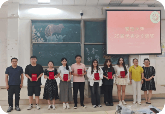 管理学院举行了20级优秀毕业论文颁奖仪式。该环节由边剀老师主持,并宣读了优秀毕业论文获得者名单。常务副院长王宾容老师、党总支书记李光老师、副院长王晓欣老师为获奖同学依次颁发荣誉证书,现场响起热烈的掌声。这些优秀毕业论文在选题创新、研究深度、写作规范等方面表现突出,为在场的毕业生树立了榜样。颁奖环节不仅是对获奖同学学术成果的高度肯定,更激励着全体毕业生以严谨的态度投入到毕业论文的创作中。随后,张琪代表发言分享了她的论文和实习经验,以自己的毕业论文撰写经历,讲述了如何在导师指导下确定选题、收集资料、开展研究和撰写论文的全过程。她建议学弟学妹们主动与导师沟通,充分利用学校图书馆和数据库资源,在论文写作中多思考、多修改,不断完善研究内容。此外还分享了自己的实习经历,实习不仅让自己掌握了实际工作技能,还学会了如何与同事沟通协作、处理工作中的突发问题。最后她鼓励学弟学妹珍惜实习机会,积极主动学习,在实践中积累经验、提升能力。