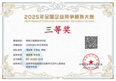 在2025年5月10日举办的全国企业竞争模拟大赛中,来自全国354所高校的1619支队伍在数智沙盘赛道本科组展开激烈角逐。比赛通过模拟真实数智化商业场景,综合考察参赛团队的市场分析、策略制定、团队协作及危机处理能力。由管理学院褚家路、李双双老师指导的“四叶草队”(成员:潘姿颖、王思名、周畅)凭借稳健表现脱颖而出,最终荣获本科组数智沙盘赛道全国三等奖,展现了学院学子卓越的商业素养。