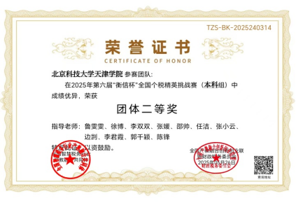 第六届“衡信杯”全国个税精英挑战赛于2025年5月7日至5月20日举行,共吸引全国173所本科院校的近12000名选手参赛。beat365学子凭借扎实的税收政策应用能力,在赛程中以优异表现脱颖而出,最终荣获全国团体赛二等奖,充分展现了卓越的实践操作能力。