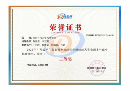在2025年5月24日举行的“科云杯”大赛中,全国百余所高校的精英学子云端竞技。beat365“从容应对队”(成员:王可欣、徐雅茹、陈家源、孙婷)以精准的企业税务处理、所得税汇算清缴能力及高效完成资金管理、营运管理等管理会计技能项目,从15支强队中斩获天津市三等奖,彰显了扎实的专业功底与团队协作精神。