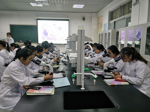 11月21日下午护理系医学基础实验课正式开课。教务处长张建华老师与韩苗苗老师亲临5-105《人体形态学》实验室观摩了贾明昭教授的实践课,并给予高度评价。