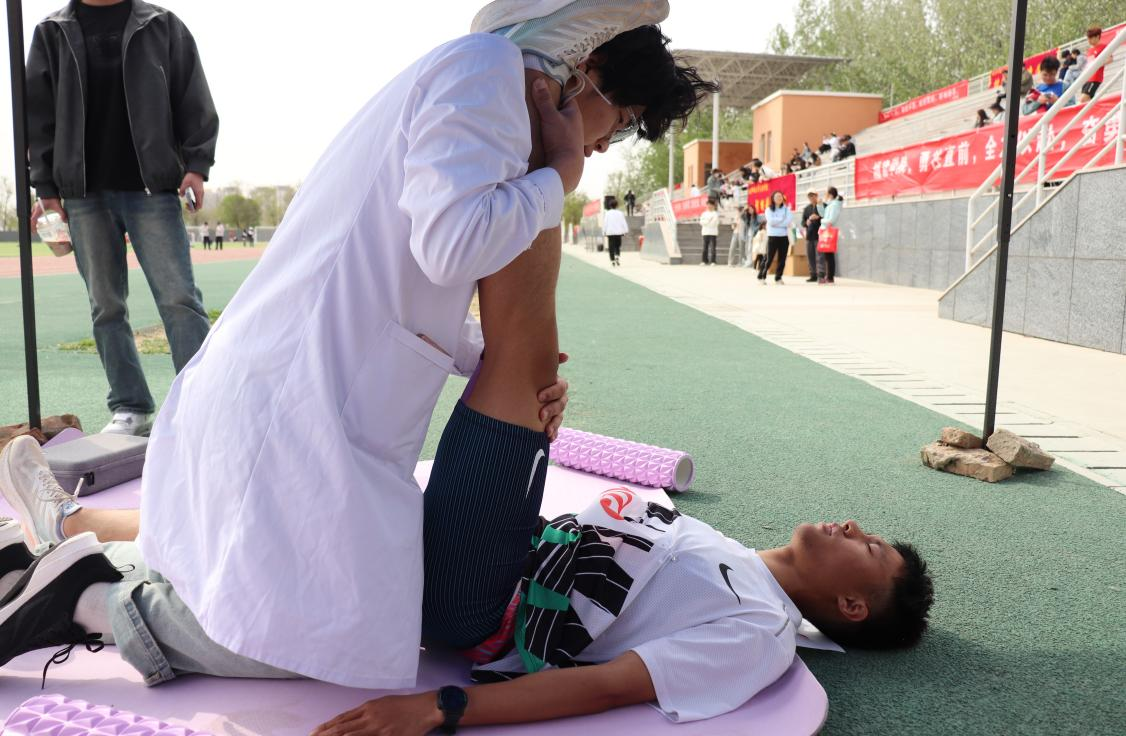 4月19日,师生代表们在学院西操场开展志愿服务活动。在校运会比赛的各个阶段,康复治疗系的师生志愿者们都积极的为参赛者进行拉伸指导和肌肉放松,确保每位运动员都能在安全和舒适的环境中恢复体力。康复治疗系的师生们不仅提供了专业的拉伸服务,还借此机会向学院师生普及健康运动和科学恢复的重要性。他们通过现场演示和讲解,让更多人了解正确的拉伸方法和运动后的恢复技巧,从而提高师生的健康意识和生活质量。他们的专业知识和热情服务得到了师生们的一致好评。