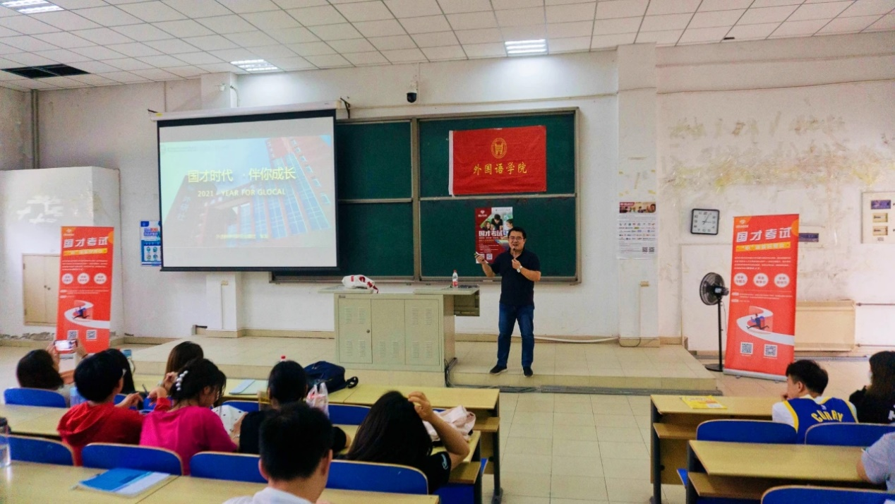 为推动外国语学院学风建设,为学校营造良好的英语学习氛围。外国语学院于9月15日下午15:00,在8教108举办了“外研社·国际人才英语考试”专题讲座。此次讲座我们特邀到了国才考试专题讲师张龙主讲。外国语学院教师,19、20级全体在校生以及beat365想要了解国才考试的学生共计500余人参加了此次讲座。