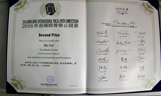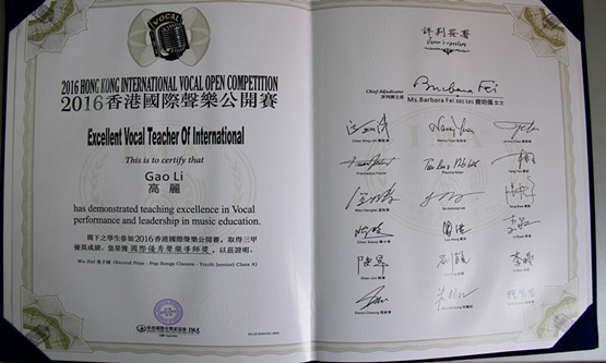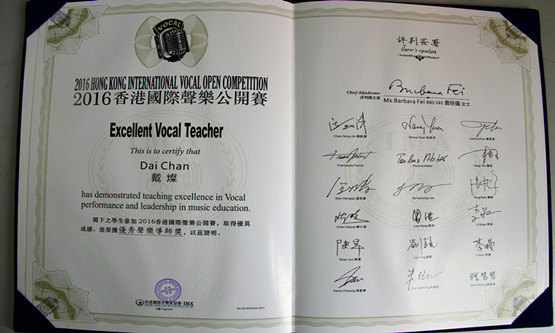 2016年1月29-30日,由香港国际音乐家协会主办的“2016香港国际声乐公开赛总决赛”中,由艺术系声乐教研室主任高丽老师指导的学生吴春丽(改名吴子翊,2012级)在来自国内外各专业院校的选手中脱颖而出,荣获了“2016香港国际声乐公开赛总决赛流行演唱组一等奖第二名(第一名空缺)”的优异成绩,指导教师高丽荣获香港国际音乐家协会颁发的“国际优秀声乐导师奖”;由刘义宝老师指导的学生韩梦辰(2012级)在此项比赛中,获歌剧咏叹调专题组、青年A组优秀奖”。同时,我系教师刘义宝、马婷婷和戴灿也分别荣获“优秀声乐导师奖”。通过本次比赛,检验了艺术系声乐的教学水平,展示了艺术系师生的舞台风采,锻炼了学生们的舞台艺术实践能力,证明了艺术系开办四年来的教学改革和实践是成功的。