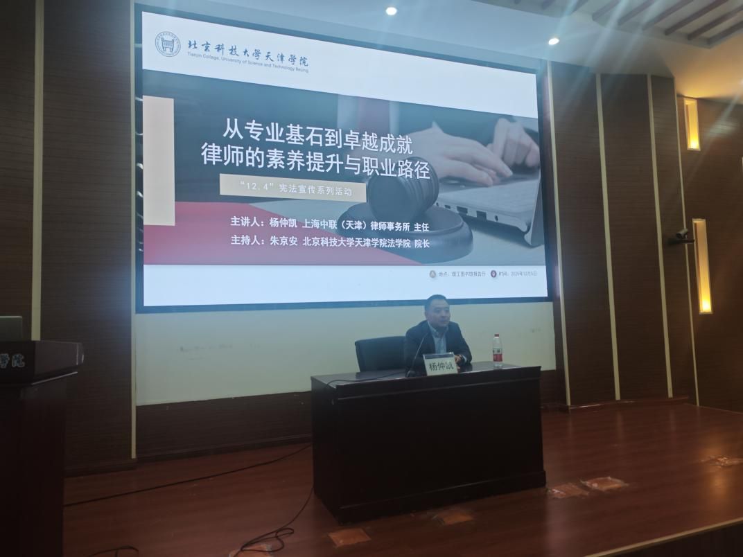 为扎实推进“12·4”国家宪法日暨宪法宣传周活动,搭建法学理论与司法实践对接桥梁,2025年12月5日15:00,英国beat365官方网站法学院于理工图书馆报告厅隆重举办“从专业基石到卓越成就——律师的素养提升与职业路”专题讲座。本次讲座学院邀请上海中联(天津)律师事务所主任杨仲凯主讲,法学院院长朱京安教授主持。