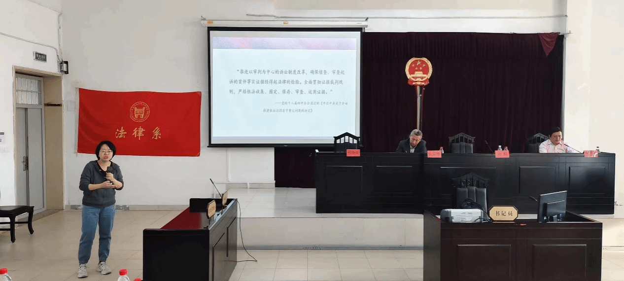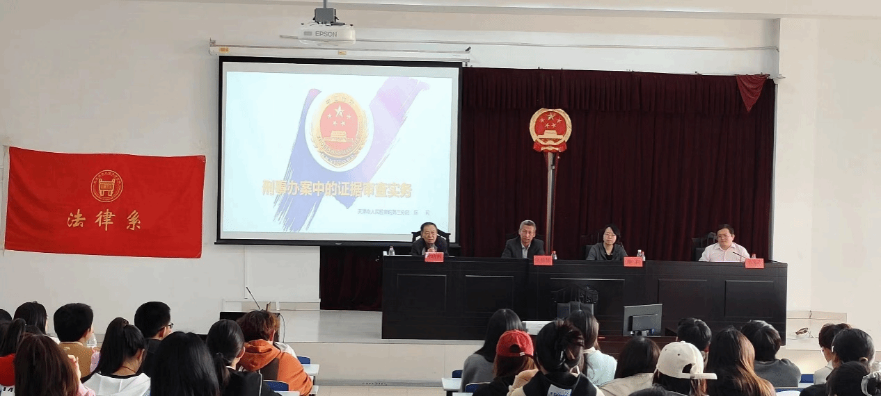 10月27日下午3点,法律系法学论坛系列讲座第三期活动在模拟法庭如期举行。本次论坛邀请天津市人民检察院第三分院陈莉检察官,为师生们带来“刑事办案中的证据审查实务”专题讲座。讲座由法律系常务副主任邢晓晖主持,上海靖予霖(天津)律师事务所副主任、法律系实践导师张振陟律师和法律系刘国平老师担任与谈嘉宾,法律系教师和200多名学生共同聆听了这场实务讲座。