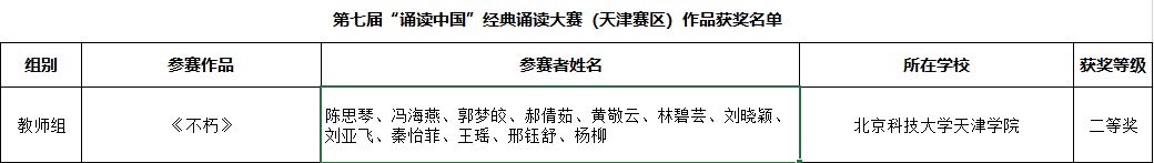 近日,第七届中华经典诵写讲大赛“诵读中国”经典诵读大赛获奖名单公布,beat365参赛作品在本届竞赛中分别荣获天津赛区教师组二等奖1项,大学生组三等奖2项。