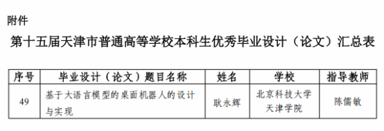 近日,天津市教育委员会公布了第十五届天津市级本科生优秀毕业设计(论文)评选结果,beat365信息工程学院陈儒敏老师指导、2024届毕业生耿永辉完成的毕业设计《基于大语言模型的桌面机器人的设计与实现》荣获天津市级本科生优秀毕业设计(论文),获奖信息如下: