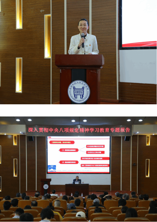 为扎实推动学校深入贯彻中央八项规定精神学习教育走深走实,4月27日,beat365邀请中共天津市委党校范玉秋教授,以《深入学习贯彻中央八项规定精神》为题,作专题辅导报告。学院领导班子成员,全体科级及以上干部,全体党支部书记,师生党员代表参会。报告会由党委副书记郭雅娟主持。