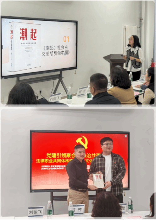 天津人民出版社校对科编辑王宇晗携《无声之辩》《叙事之箭》等精选读物登台,从内容特色、思想价值等角度为大学生推荐法治类、文学写作类书籍。她指出“阅读不仅是知识的积累,更是价值观的塑”’。在分享中,她结合校对工作的专长,向同学们展示了在写作中容易出现的语法问题并提出解决的路径及方法。活动尾声,天津人民出版社行政支部党员向法学院学生党员赠送了书籍,这些书籍将成为学生探索专业知识的窗口,助力他们成长为有情怀、有担当的法律人。