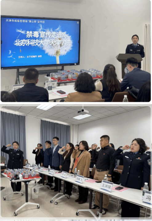 在禁毒宣传环节,天津市女子强制隔离戒毒所二大队警察郝蓓以“预防毒品,守护青春”为主题,结合其一线戒毒工作经验,向师生讲述了青少年误入歧途的真实故事,并强调“一次好奇可能毁掉一生,禁毒教育必须从认知到行动全面渗透”。宣誓环节,全体人员庄重起立,右手握拳,在领誓人的带领下郑重承诺,“我宣誓:珍爱生命,远离毒品,积极参与禁毒斗争……”铿锵有力的誓言回荡在会场。