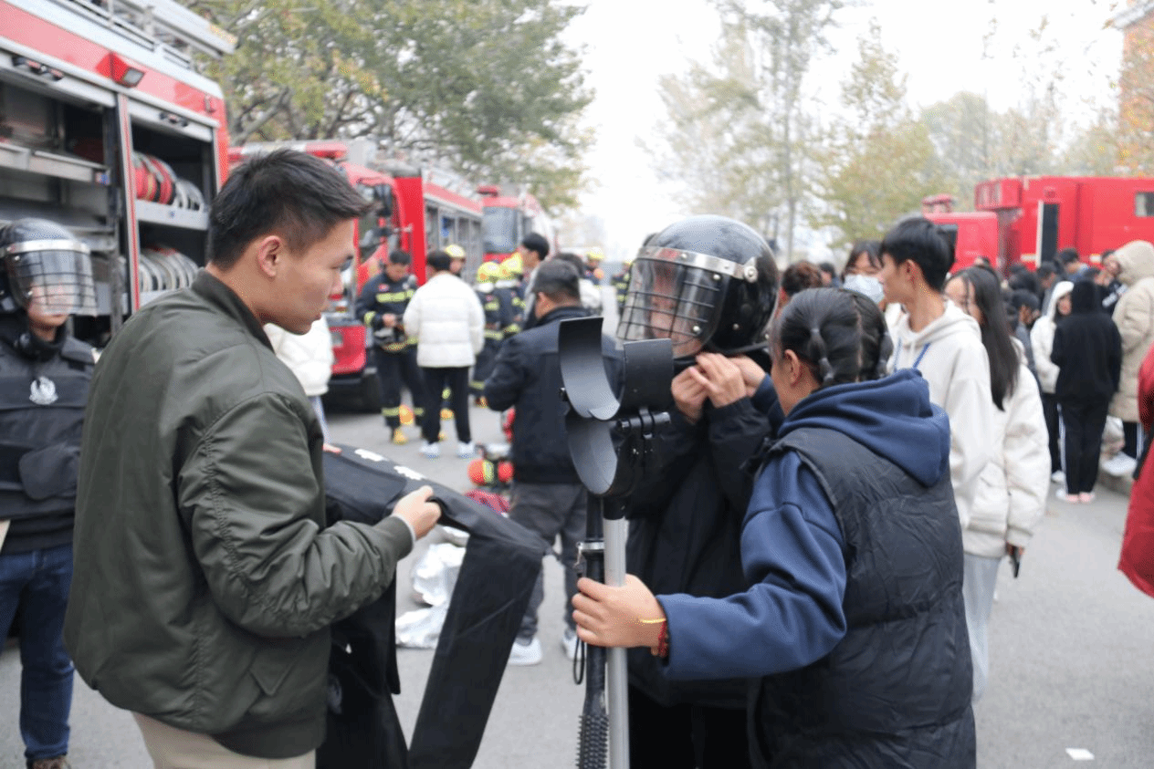 11月15日,学院联合新城消防救援站和派出所,在学院小广场前和理工馆消防通道,分别开展反诈签名和消防应急救援装备展示体验活动。一方面,通过发放消防、反诈安全宣传单,组织同学们参与校园防火和防范网络电信诈骗签名活动,深化普及防范反诈和校园生活消防安全常识;另一方面,让同学们深入体验消防救援装备和公安防暴装备,从“听我讲”到“我试穿”、“我试用”,转变安全宣传思路和宣传方式,增添宣传活动趣味性,激发广大学生群体参与安全宣传,学习安全知识的积极性和主动性。