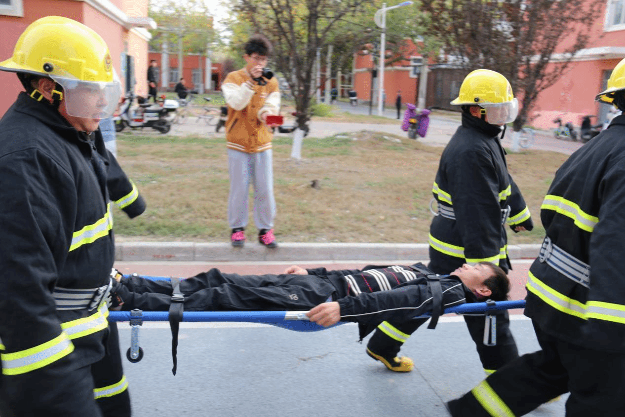 本次演练活动模拟当高层公寓内因违规使用明火引发火情的突发状况,考验同学们的应急自救互救能力和学院应急处置水平。当消防应急广播响起后,参加演练的同学们在学生安全志愿者的引导下,用湿毛巾掩住口鼻,迅速、有序从楼内步梯撤离。同时学院保卫处应急处突小分队在接警后,迅速出动,搜救被困同学,扑救初起火情。参演同学们从容不迫、秩序井然;处突队伍快速反应,果断处置。
