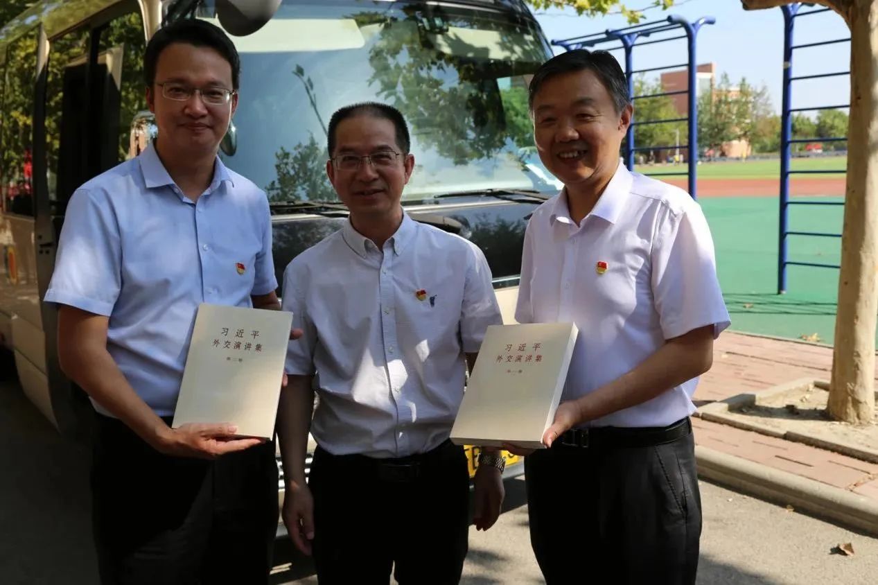 杨明伟局长向学院赠送《习近平外交演讲集》,学院院长丁煦生、党委书记叶振楠代表学院接受赠书。