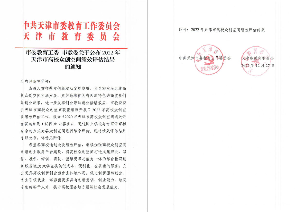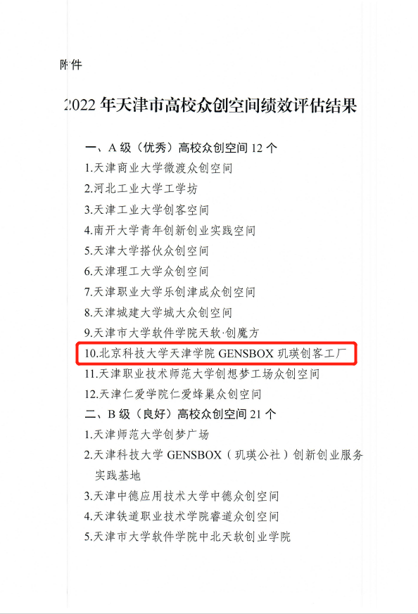 近日,天津市教育两委组织开展了2022年度全市高校众创空间绩效评估工作,beat365GENSBOX玑瑛创客工厂在此次绩效评估中再次获评天津市A级(优秀)高校众创空间。从2016年开始,beat365众创空间已连续六年获评天津市A级(优秀)。