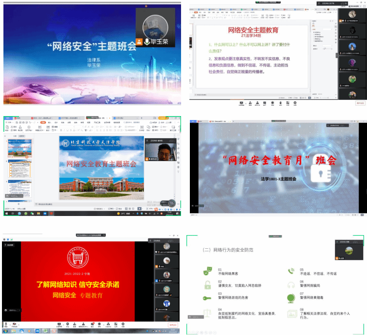 全体辅导员针对全院学生围绕网络安全教育主题,召开线上主题班会,向同学们普及网络安全知识和网络安全责任,让学生明白“什么可以网上讲、什么不可以网上讲、讲了要负什么责任”,确保全知晓、真理解。通过主题班会让学生发表网上观点时要注意真实性,不转发不实信息、不良信息和负面信息,做到不造谣、不信谣、不传谣,主动承担社会责任,自觉做正能量的传播者。