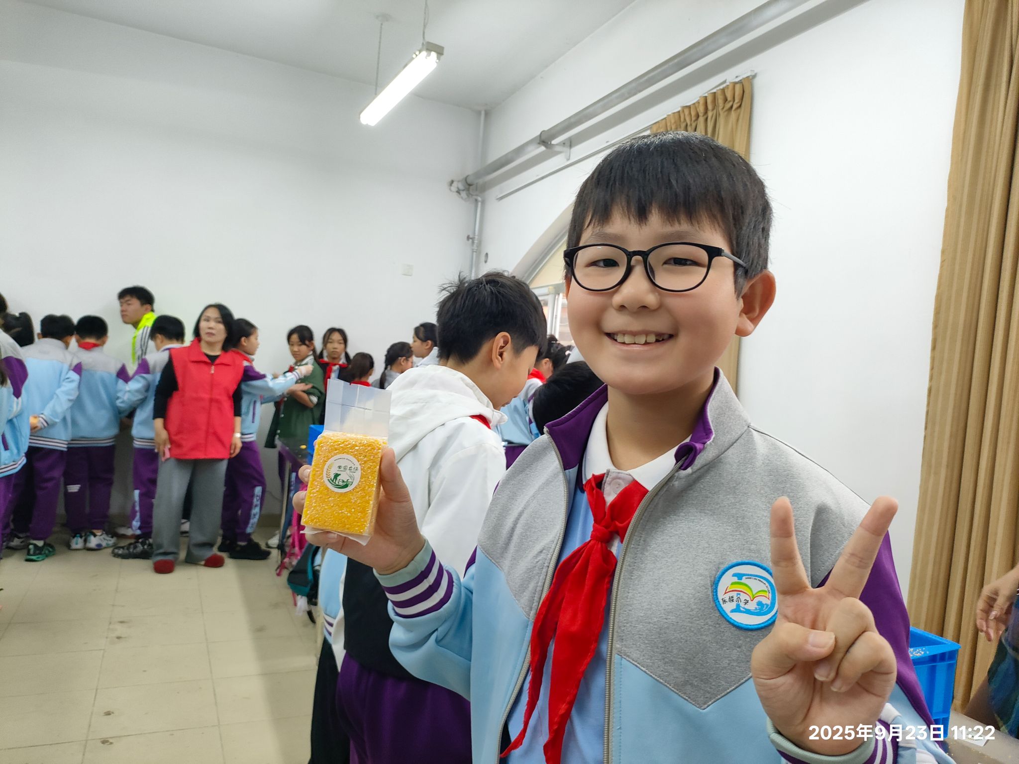 最让同学们期待的是玉米碴加工环节。在基地教室,教师讲解了玉米收获后晾晒、清洗、烘干、磨碴、筛选、包装的全工程,最后孩子们在教师的指导下,将玉米碴装袋-入模-压实-真空封装。每个孩子都获得了自己参与制作的玉米碴产品,准备带回家与家人分享。这套完整的农产品加工流程,让孩子们直观了解了从“田间到餐桌”的全过程。