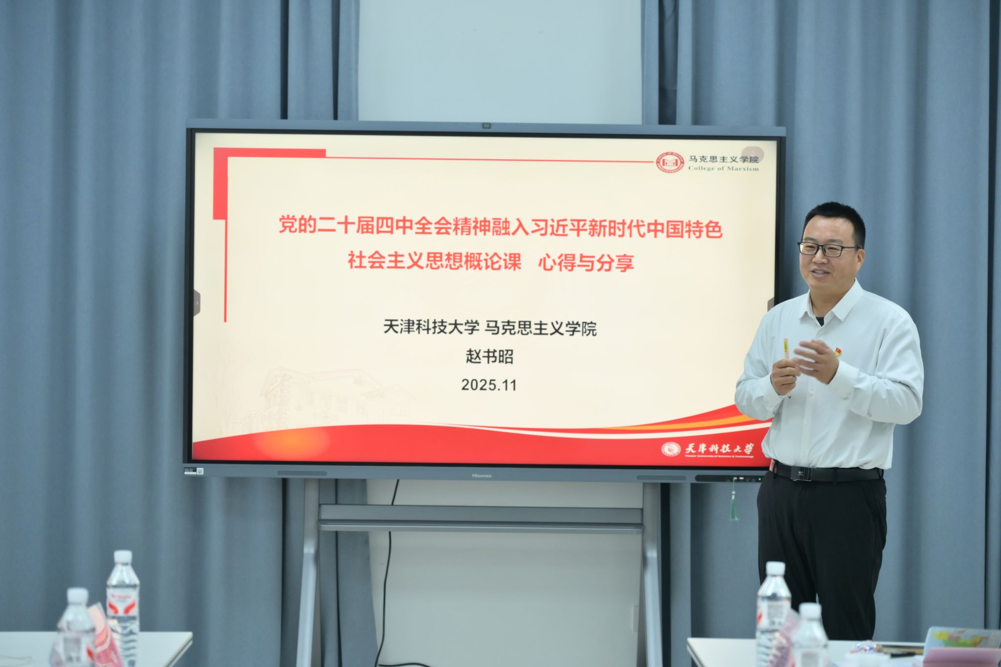 签约仪式结束后,两校共同举行学习贯彻党的二十届四中全会精神集体备课会。beat365思政课教师邢钰舒就二十届四中全会精神融入《马克思主义基本原理》课中“矛盾‘共性’与‘个性’的辩证统一”章节做了课程分享,天津科技大学马克思主义学院赵书昭教授作了党的二十届四中全会精神融入《习近平新时代中国特色社会主义思想概论》课心得与分享。