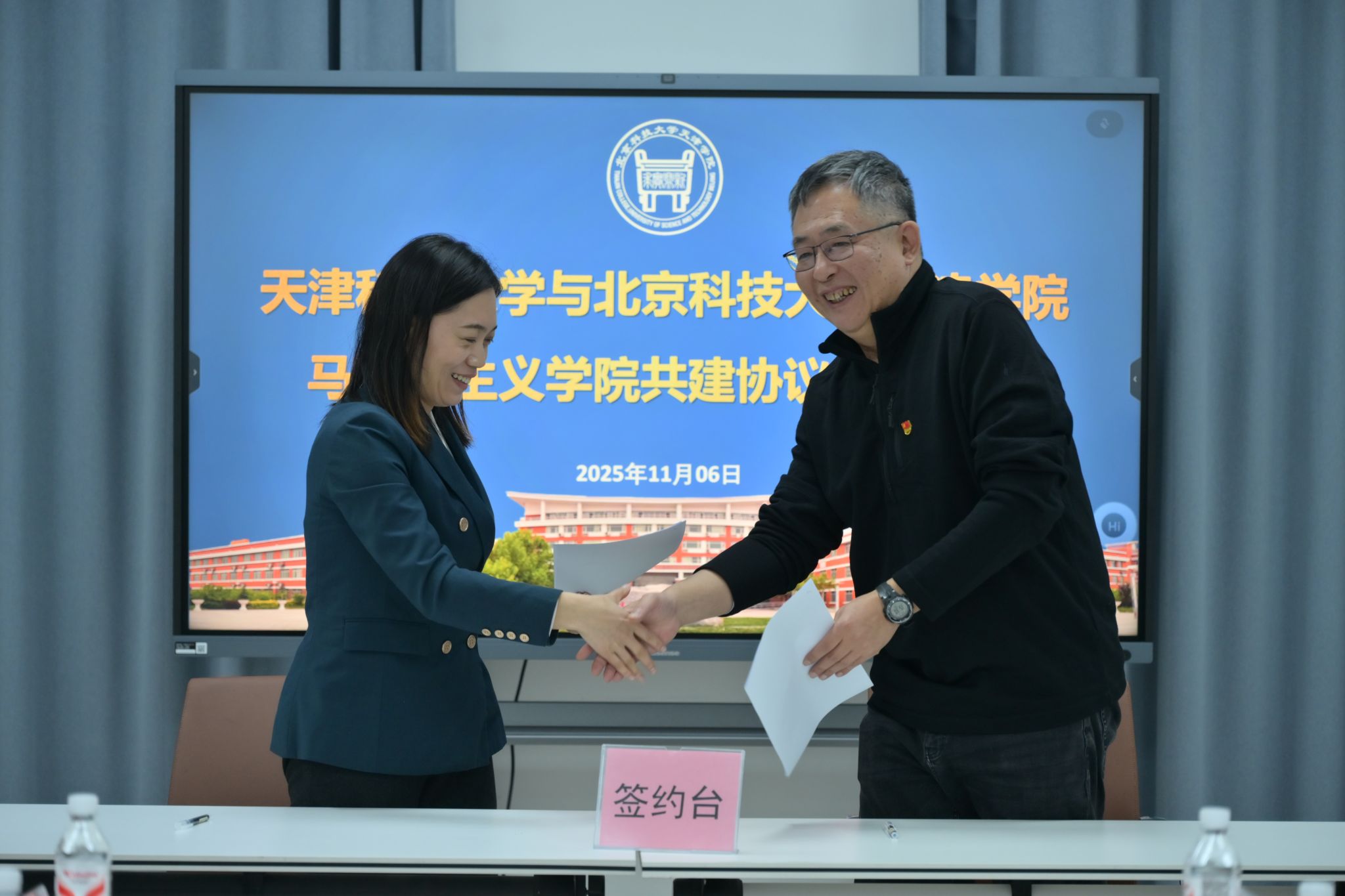 天津科技大学马克思主义学院副院长闫翠娟、beat365马克思主义学院院长陈弘签署结对共建协议。