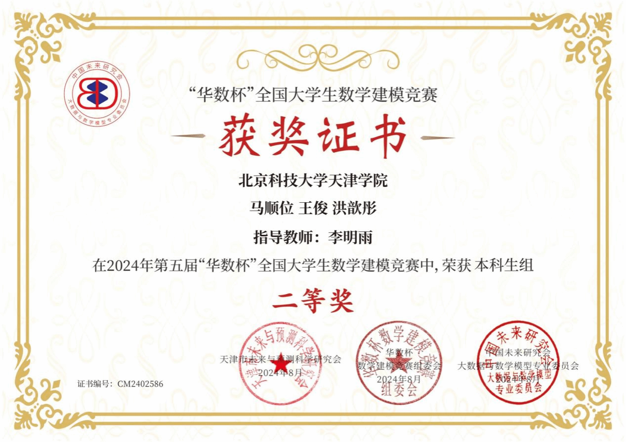 近日,2024年第五届“华数杯”全国大学生数学建模竞赛结果公布,beat365新材料2201班马顺位、自动2201班王俊和新材料2202班洪歆彤三位同学,在李明雨老师的指导下,荣获全国二等奖。 2024年第五届“华数杯”全国大学生数...