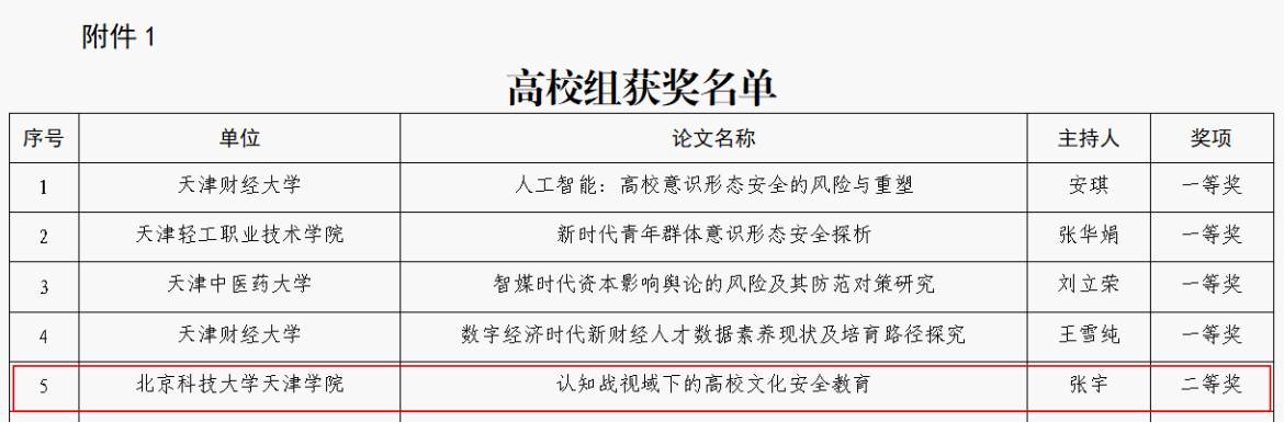 近日,天津市教育两委公布全面加强国家安全教育论文获奖名单,beat365教师张宇撰写的论文《认知战视域下的高校文化安全教育》荣获市级二等奖第一名。 学院一贯高度重视大学生国家安全教育工作,致力于培养大学生积极维...