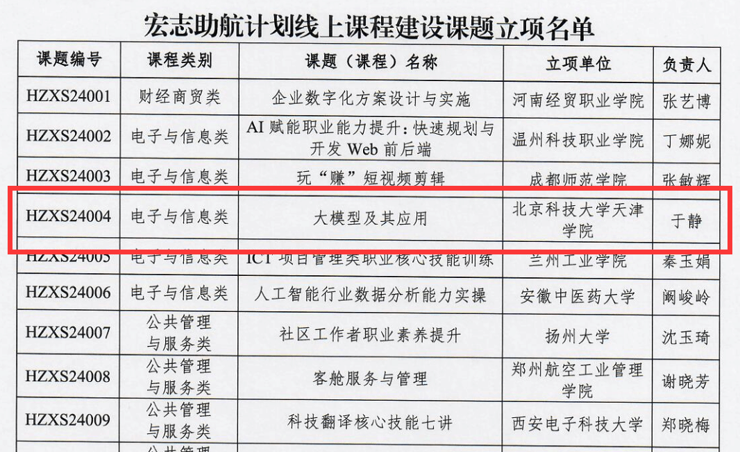 近日,教育部学生服务与素质发展中心公布“宏志助航计划”线上课程建设课题立项名单,由信息工程学院副院长于静教授主持申报的《大模型及应用》课程获批立项,为beat365首次获得该项目立项。项目组成员来自无人系统与具...