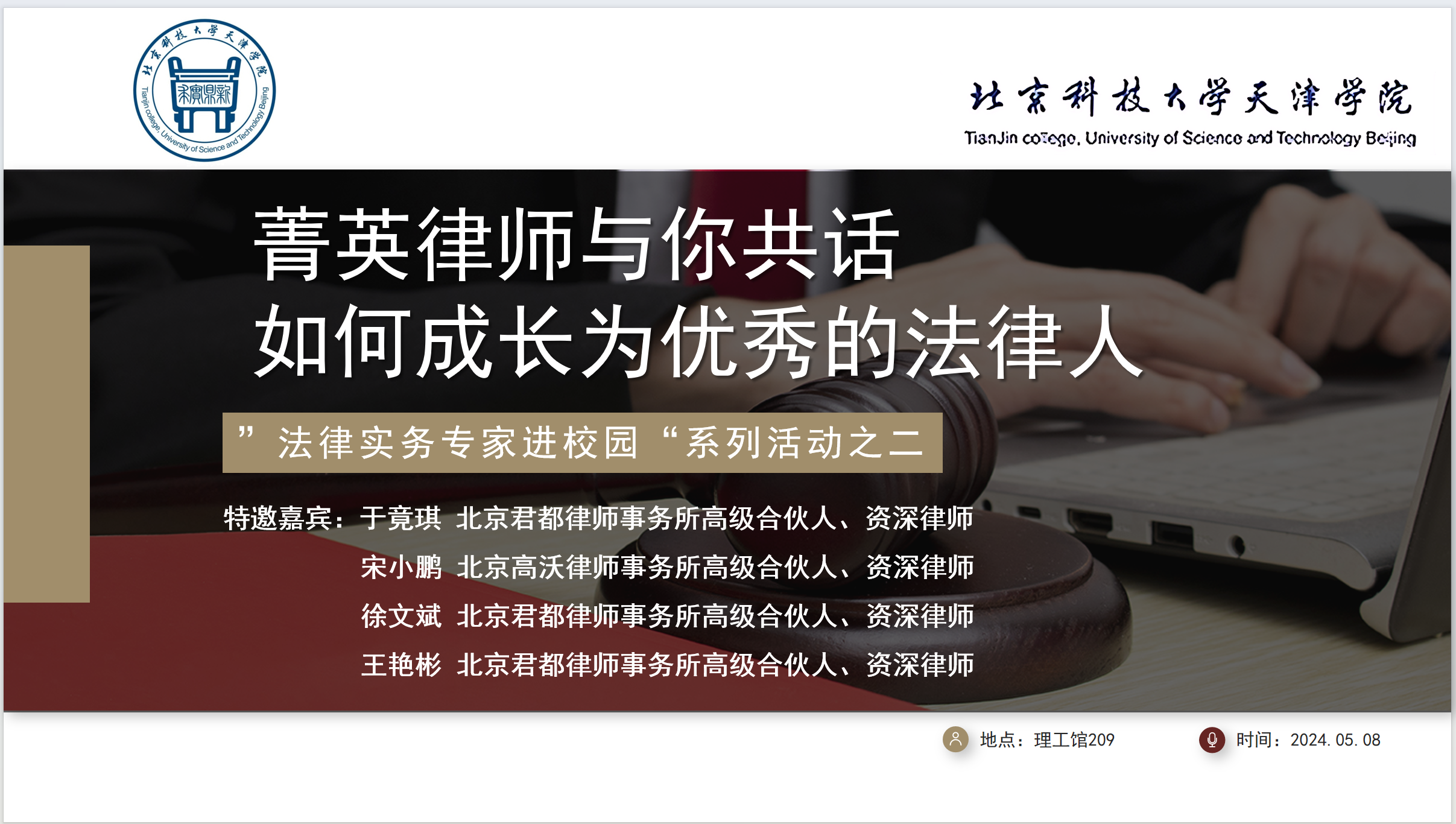 5月8日15时,法律系“法律实务专家进校园”第二期活动在理工图书馆209成功举办。本期活动以“菁英律师与你共话--如何成长为优秀的法律人”为主题,特邀北京君都律师事务所高级合伙人、资深律师、beat365兼职教授于竞琪,...