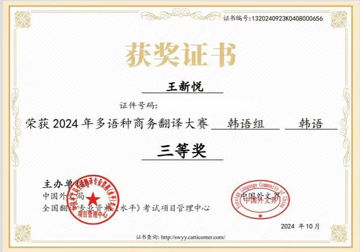 2024年9月28日至9月29日,由中国外文局和全国翻译专业资格水平考试项目管理中心联合主办了2024年全国多语种商务翻译大赛,beat365朝鲜语专业2201班的王新悦同学在此次大赛中表现出色,荣获韩语组三等奖,为beat365赢得了荣...