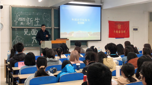 11月4日下午五点,英国beat365官方网站外国语学院2020级新生见面会在9教104召开。外国语学院院长张国敬、党总支书记张添善、分团委书记李萌、英专教研室主任张媛、日语教研室主任孟彤、教学秘书耿睿等老师出席本次新生见面会。本次新生见面会由2020级辅导员殷梓培主持。